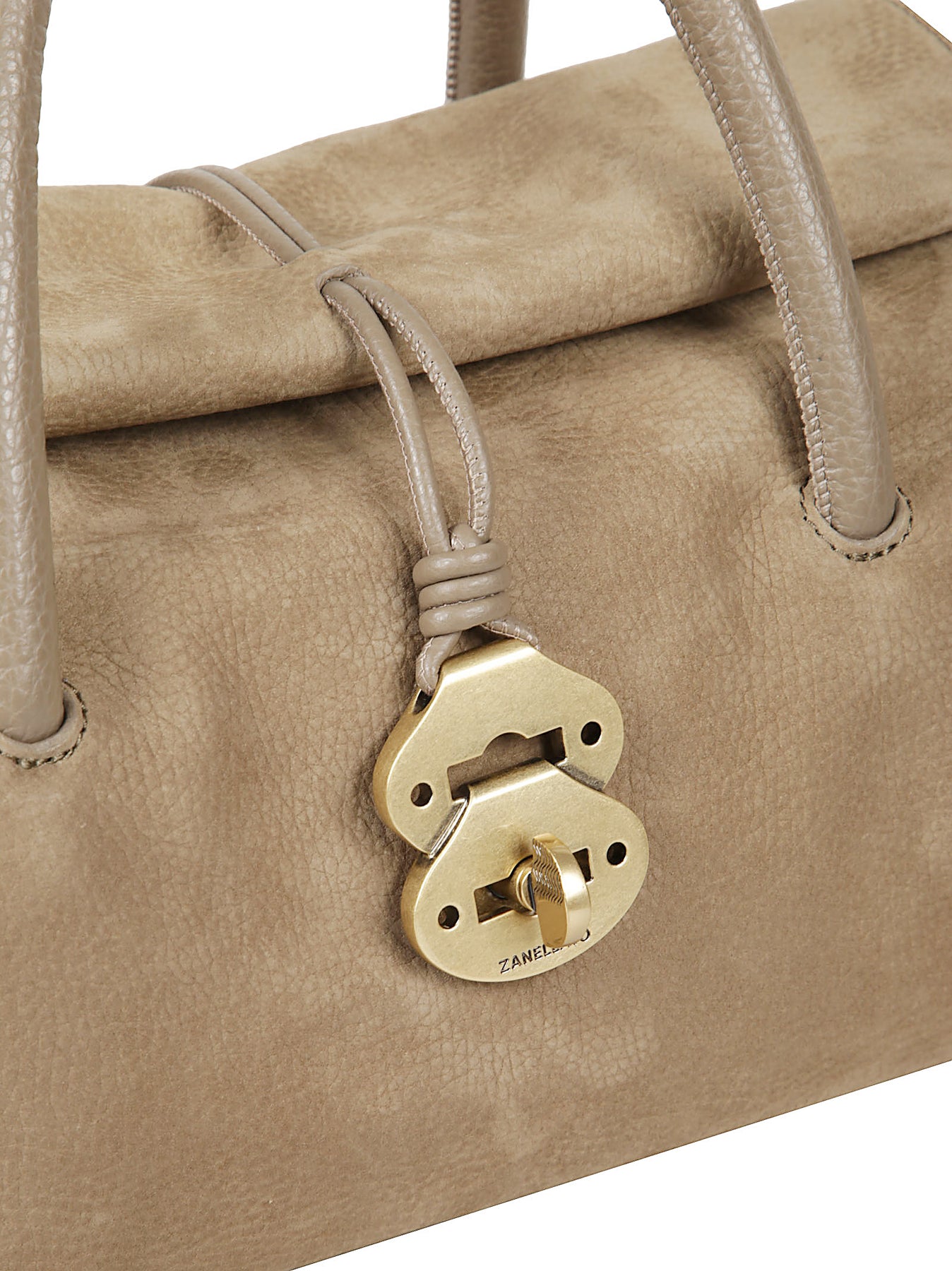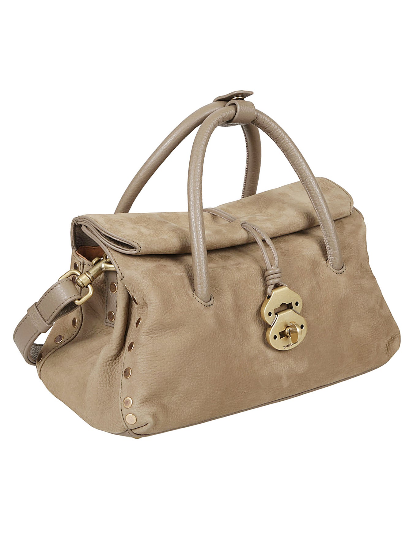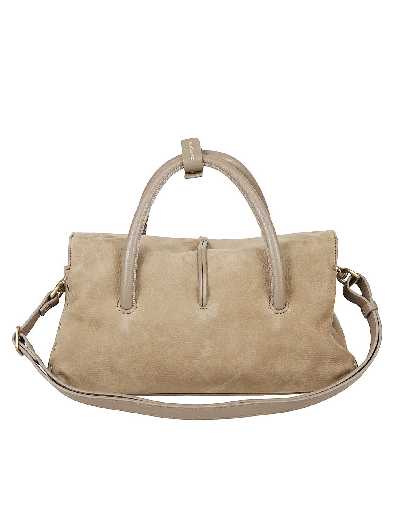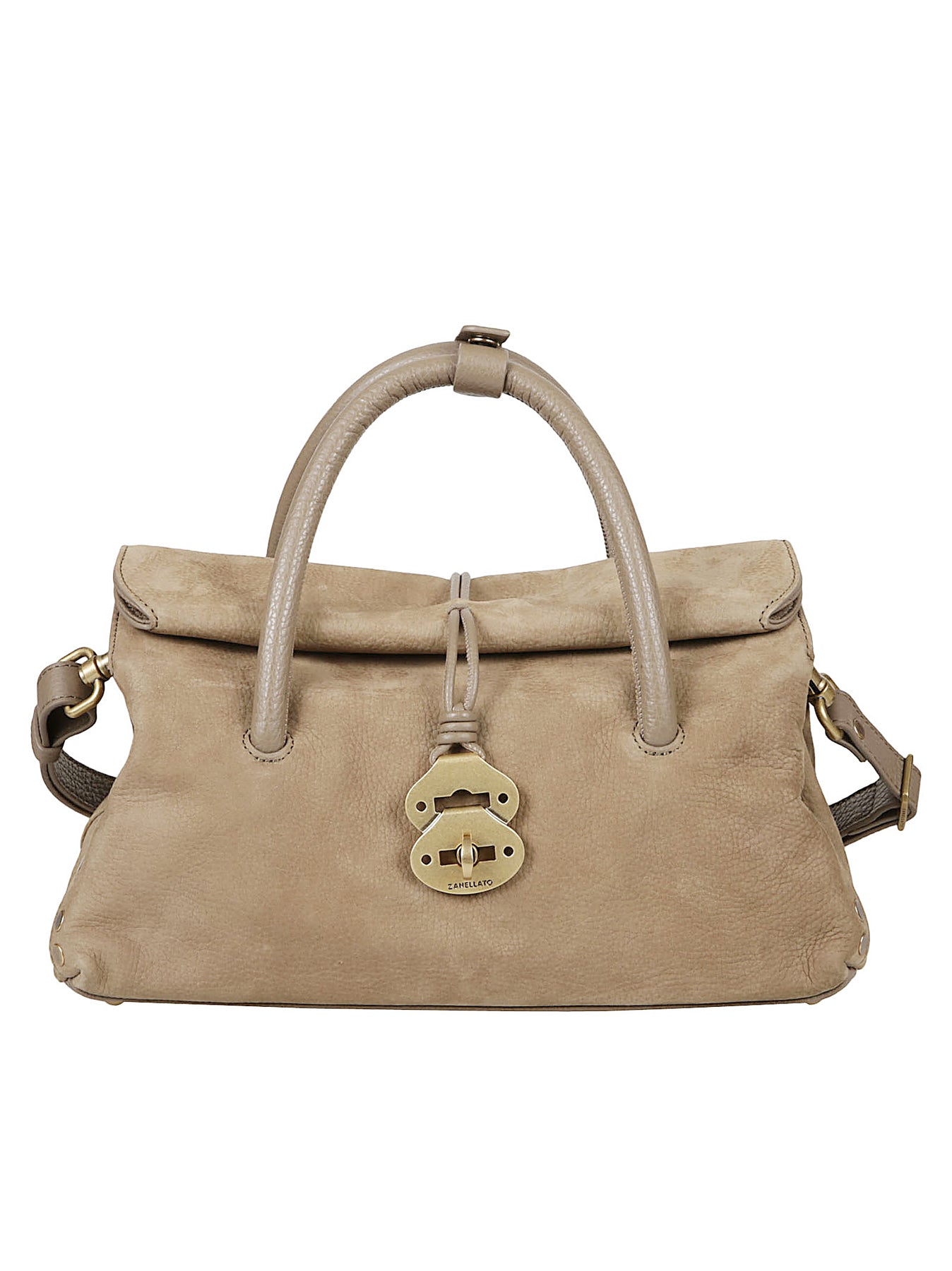 Borsa in pelle martellata Chiusura roll-top magnetica e con tubolari dotati di fibbia twist-lock Tracolla regolabile e removibile in dotazione Tasca interna Colore: greige